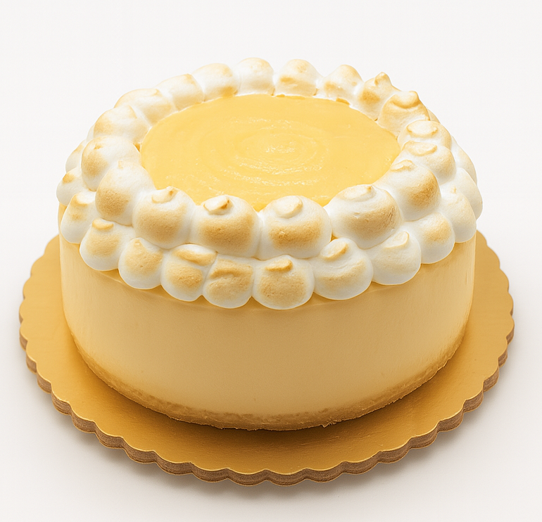 Cheesecake estilo Nueva York con base tradicional, cubierto con un suave curd de limón y decorado con suspiro flameado.