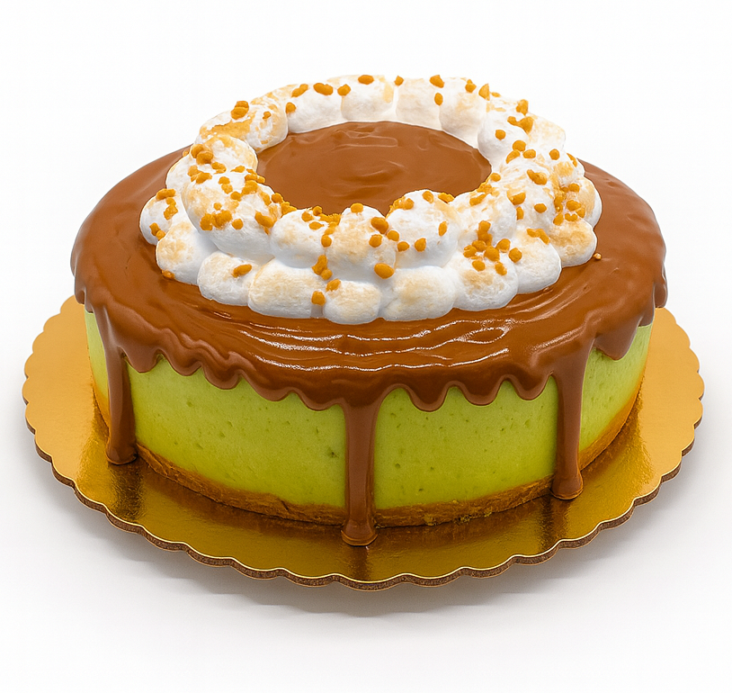 Cheesecake estilo Nueva York con base de pistacho, cubierto con dulce de leche, crema chantilly y perlas crocantes de avellana.