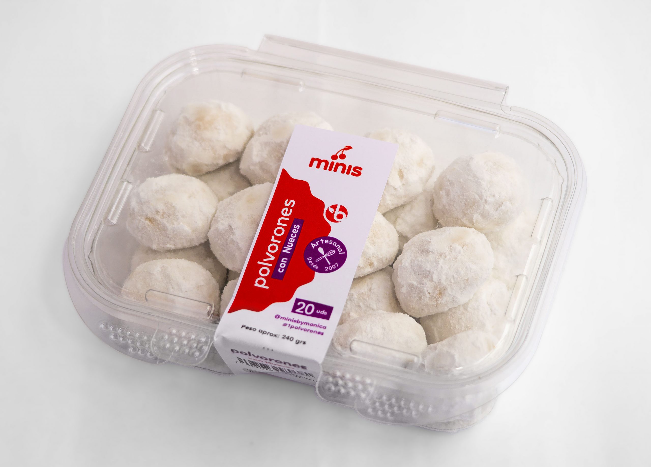Polvorones de nueces, cubiertos de azúcar pulverizada. Caja de 20 unidades.