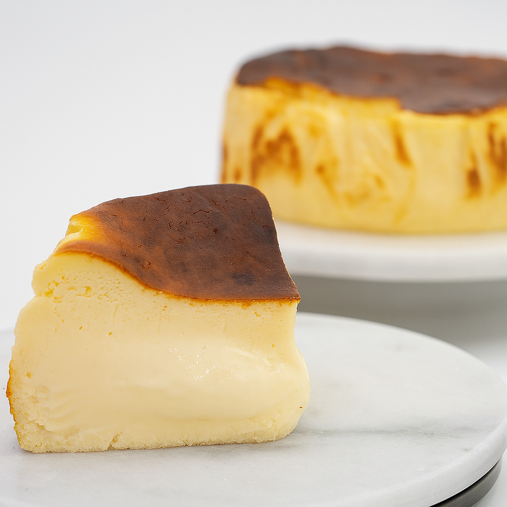 Postre de queso cremoso, con una base de masa quebrada y un exterior dorado, cuyo interior es suave y ligeramente fluido.